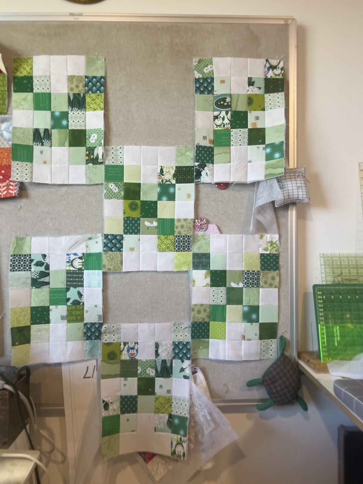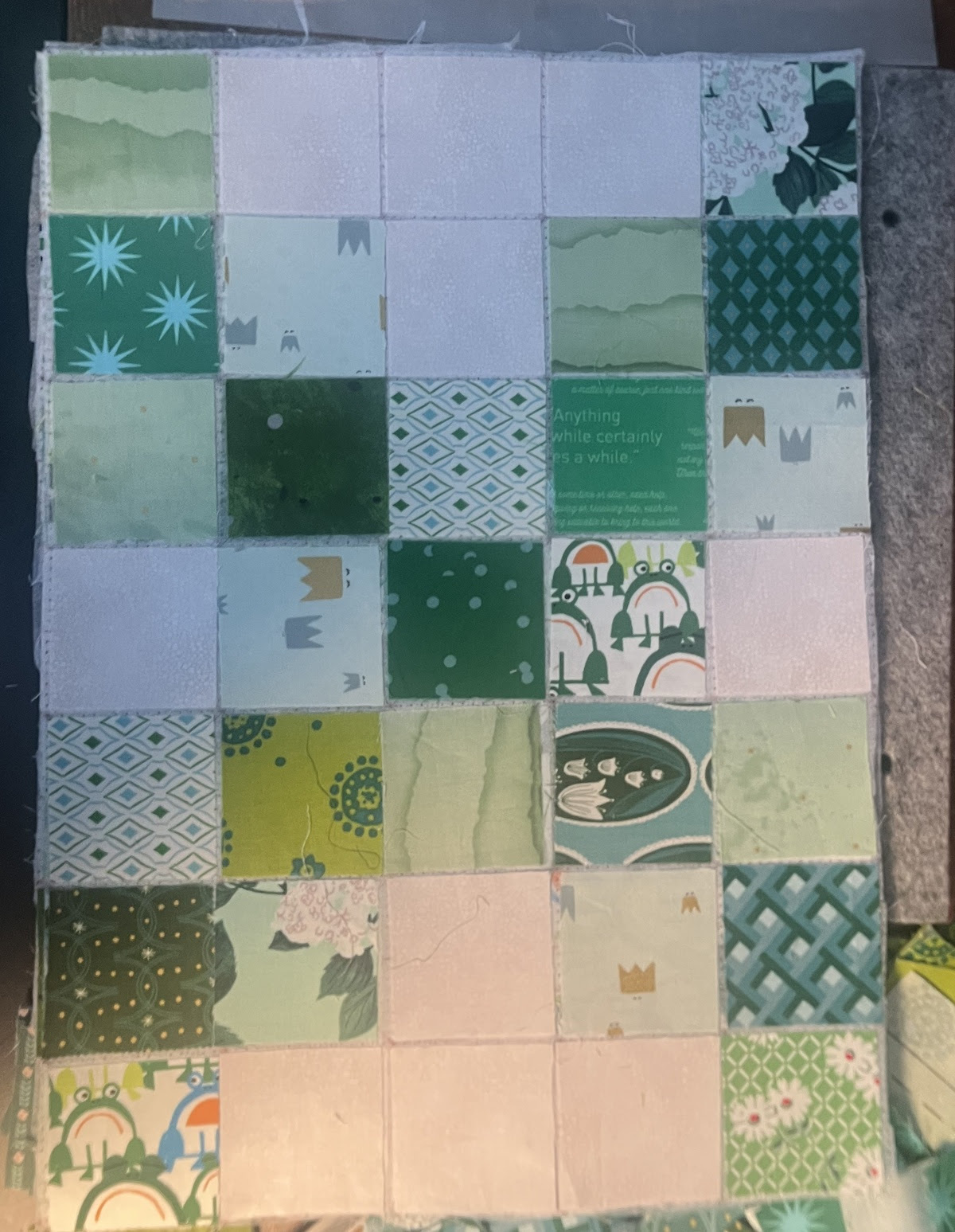 Next, take your green and white squares of fabric and lay them on the grid as shown in the picture above.