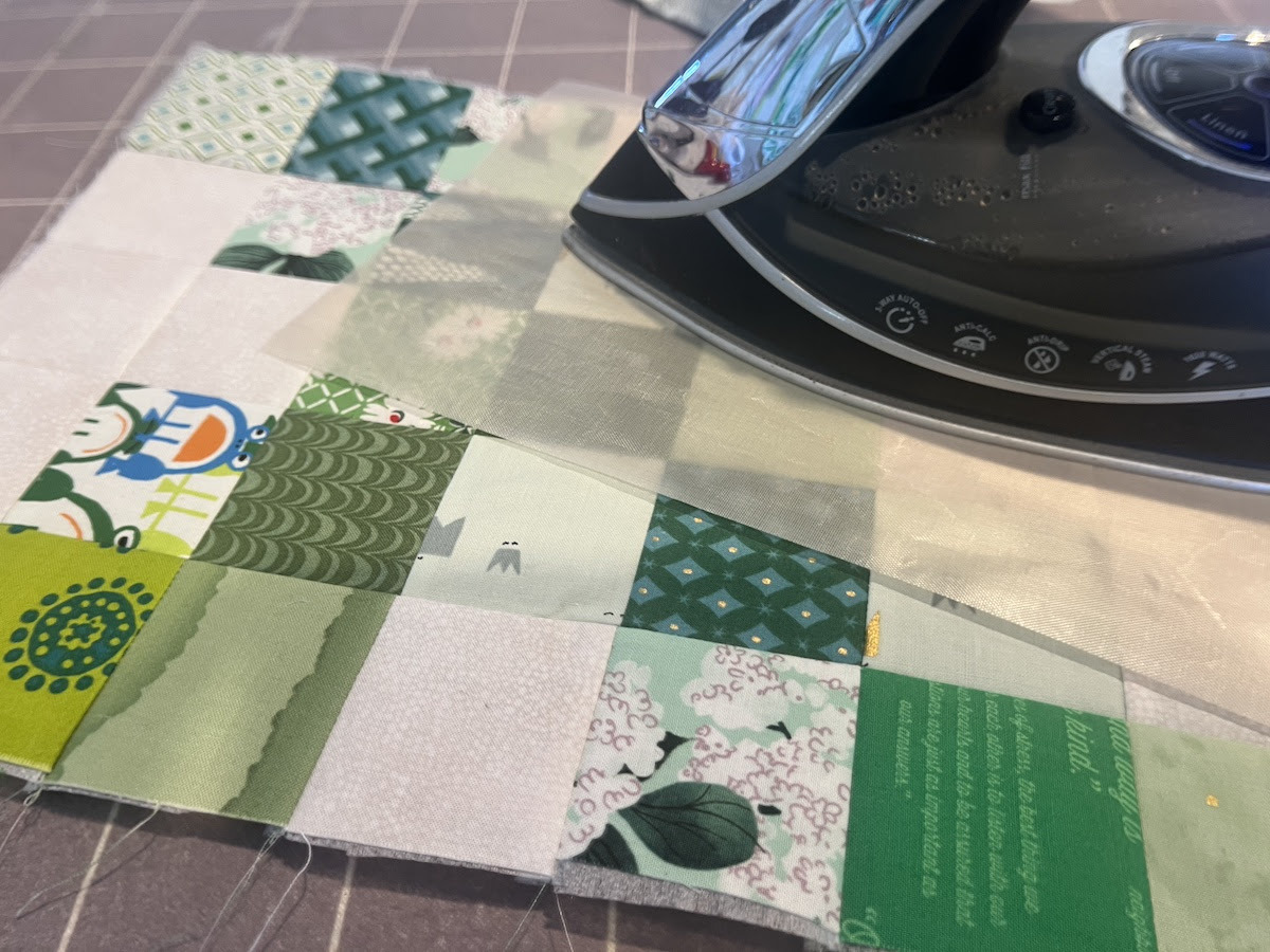 Lay your Irish chain blocks out on your design wall. Notice how the two bottom squares of one set of blocks line up with the top two squares of the blocks in the next row.
