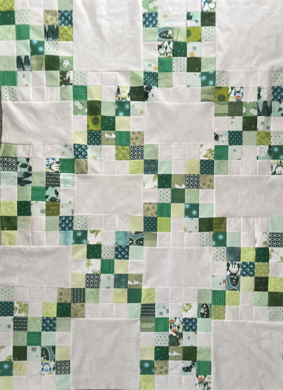 - Green print scrap fabrics cut into 2-1/2" squares (You'll need 25 squares for each rectangle. For this laptop quilt, I used 325 green squares)