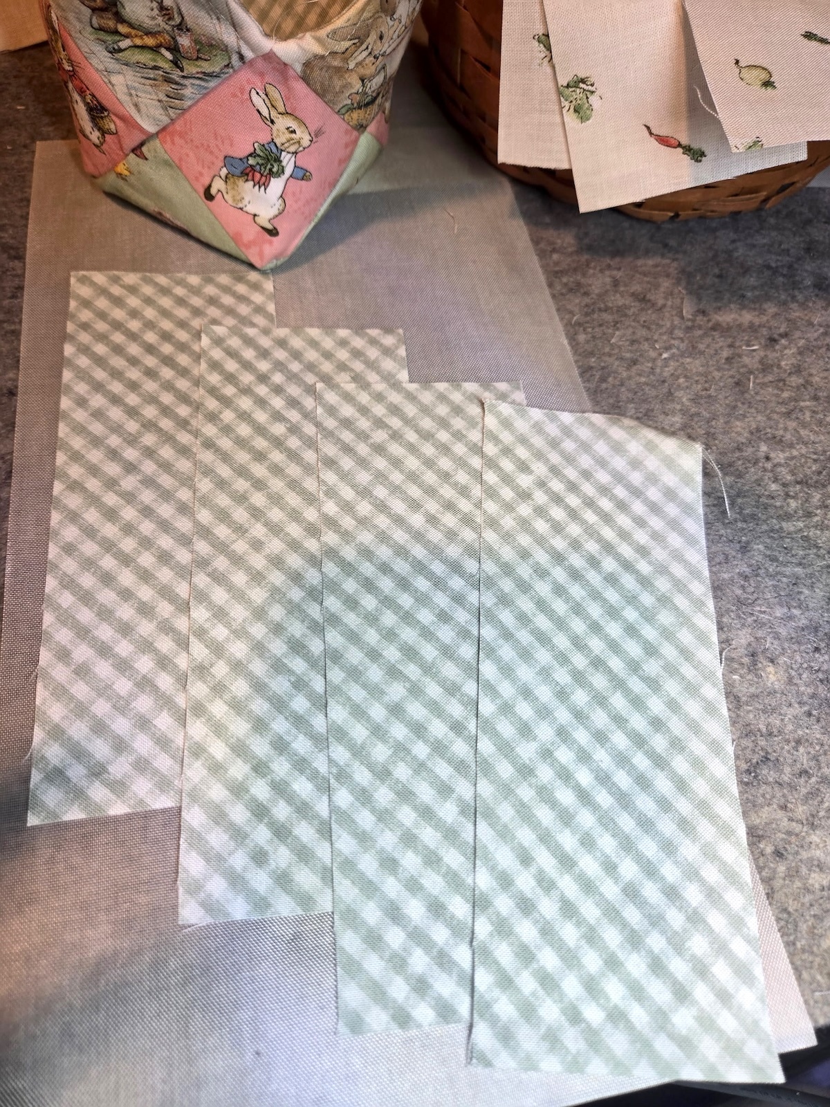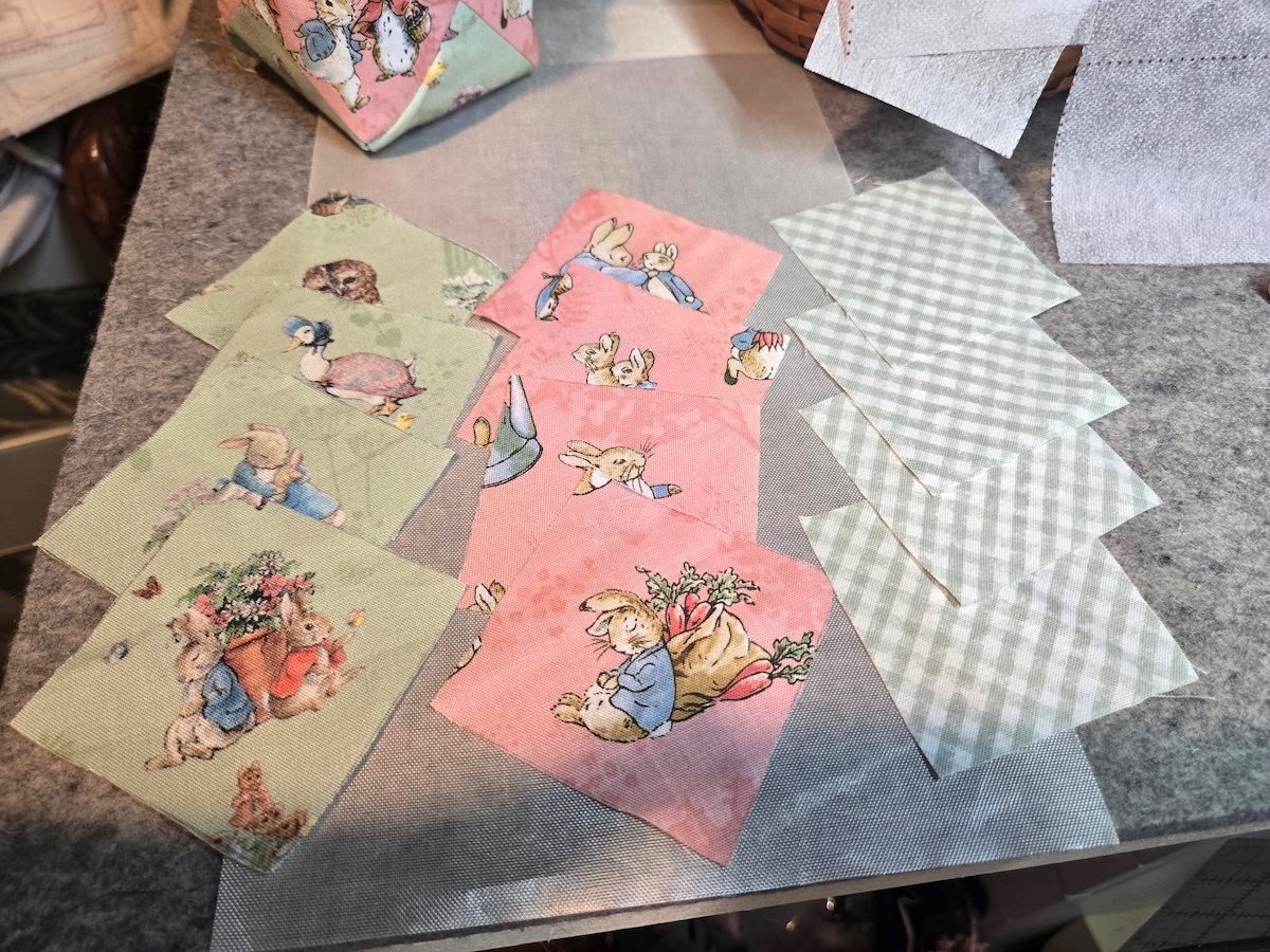 Start by cutting out twelve (12) 2-1/2" squares of fabric. I fussy-cut 8 of them for the outside of the itty bitty Easter basket.