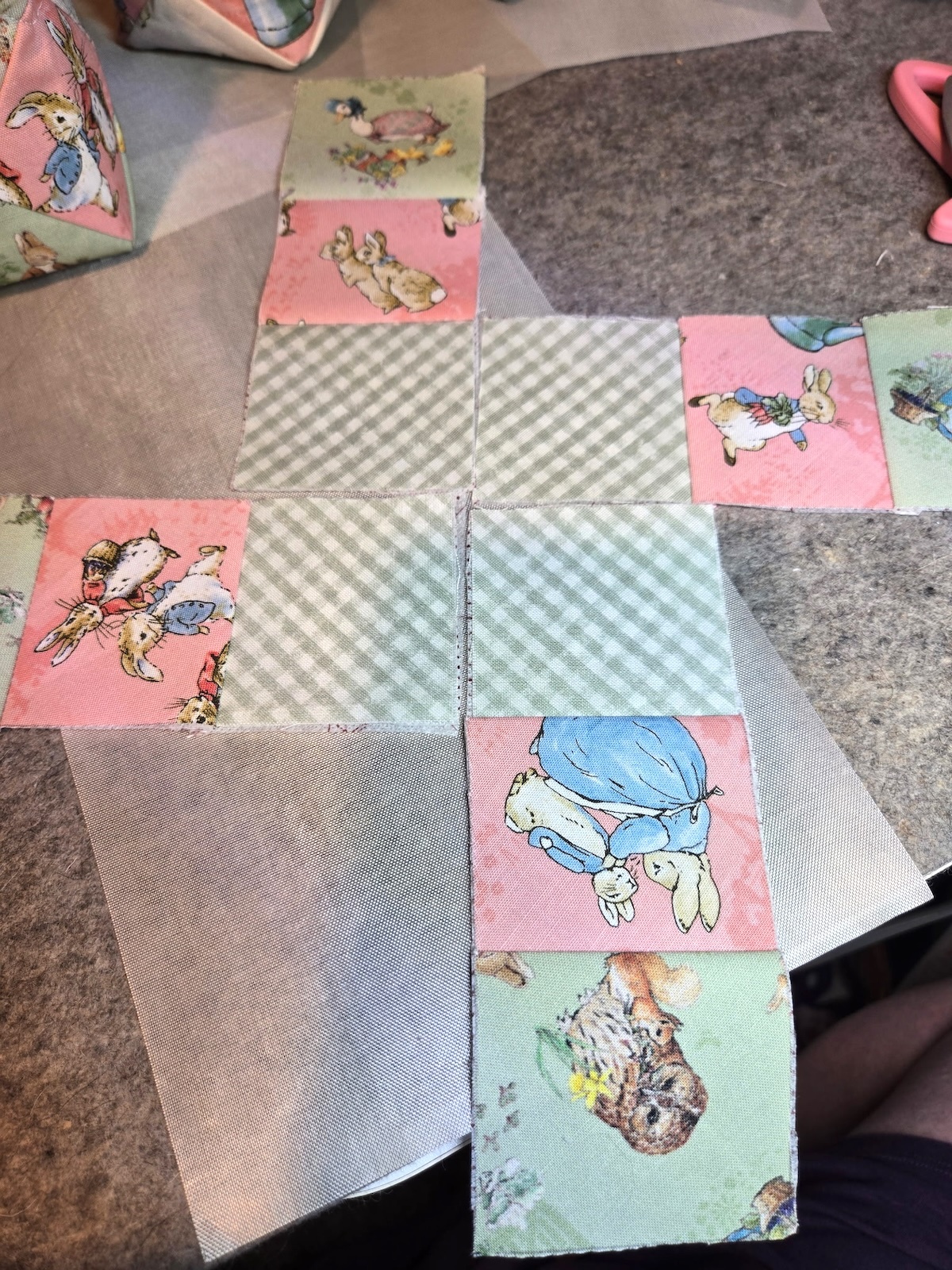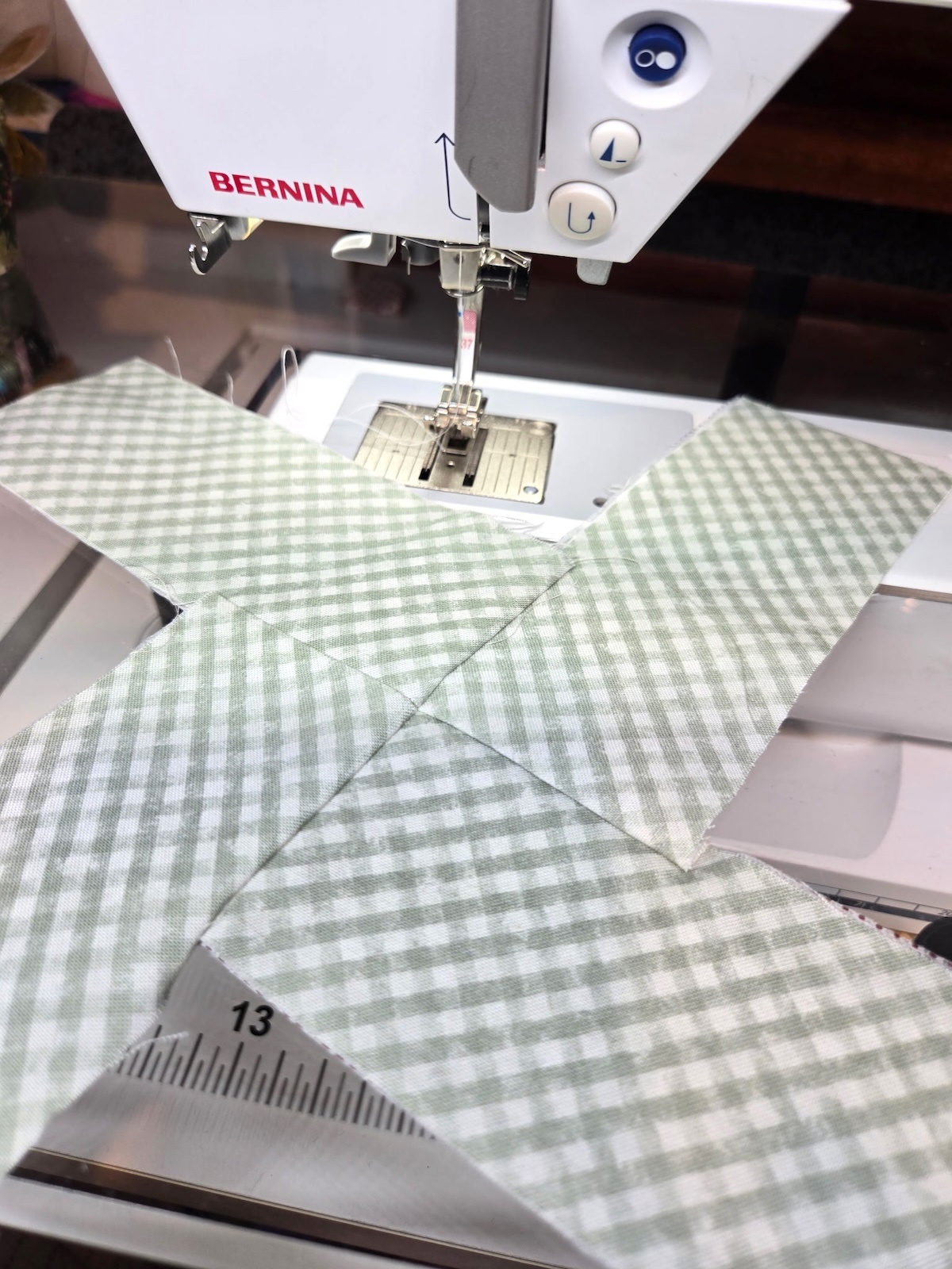 Lay out the strips as I have in the above image. Stitch the center squares together. For mine, it is the green checked fabrics.
