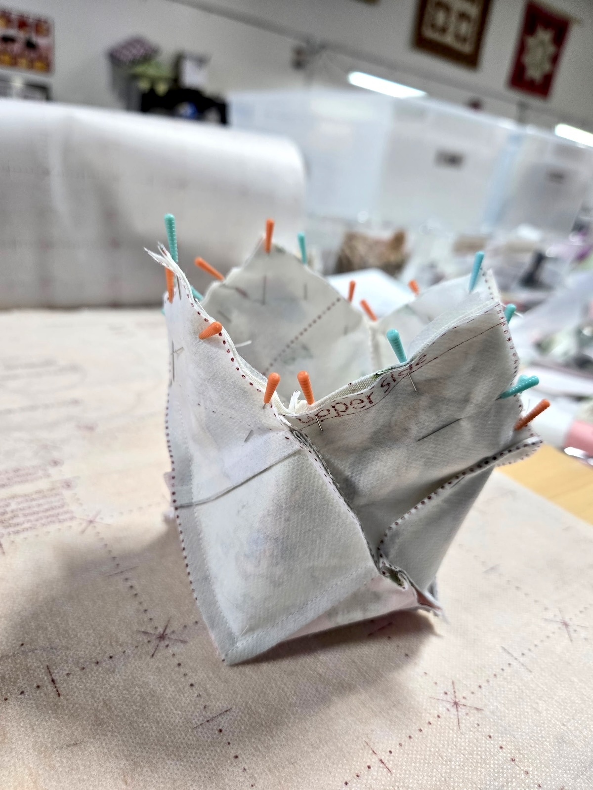 Above, the basket is all sewn together and hasn't been turned right side out.