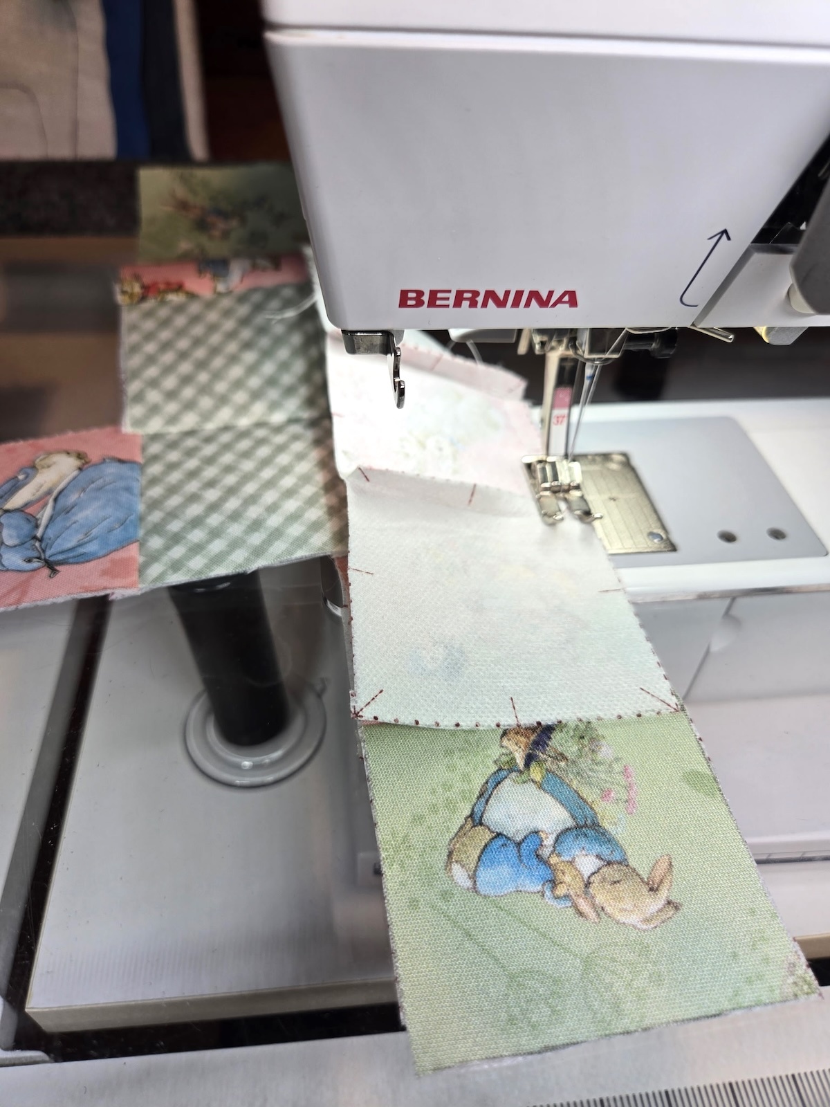 NOTE: See how I'm sewing them along the dotted line, keeping the similar fabrics in a row.