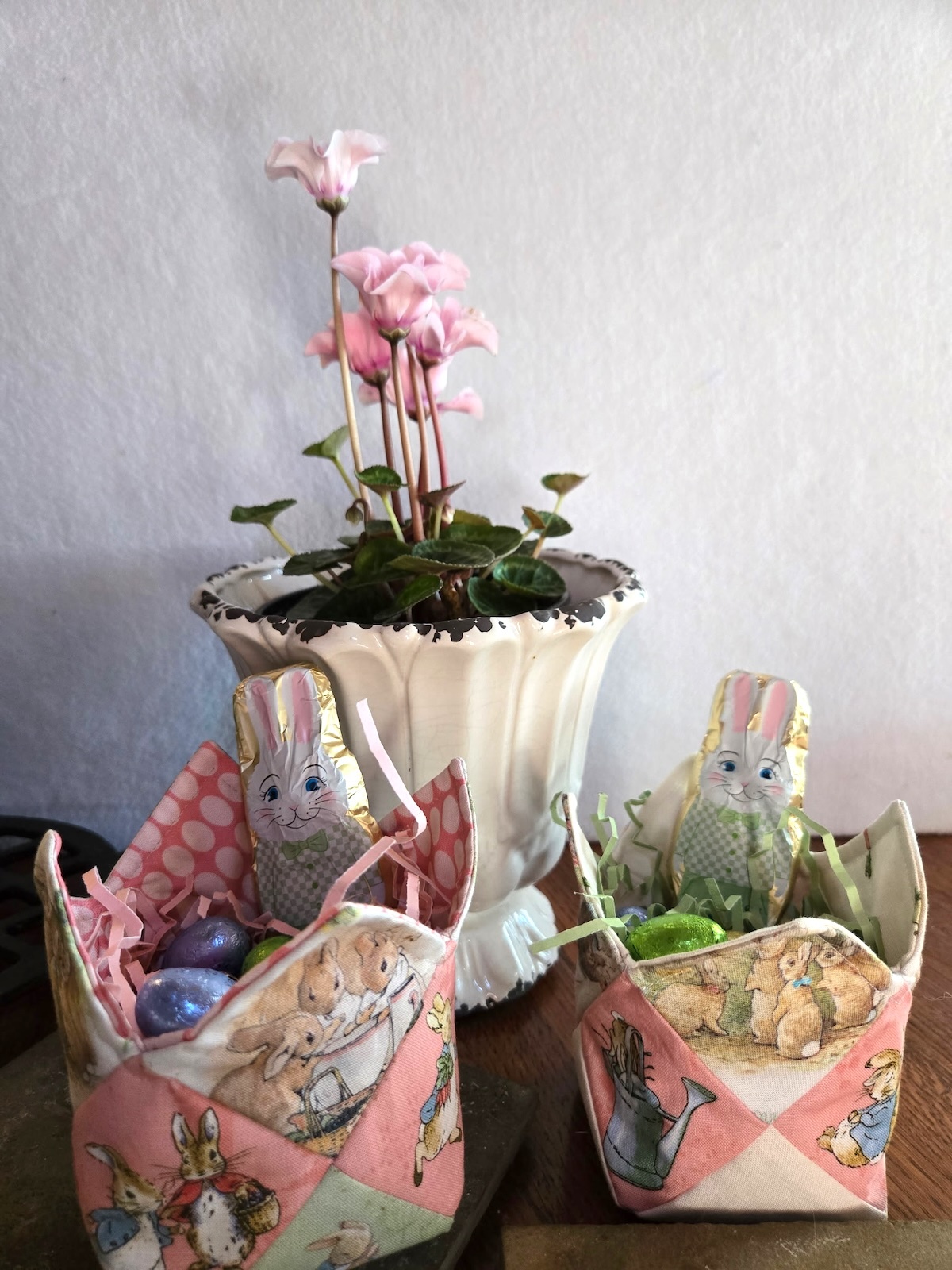 These miniature baskets use simple folding and stitching to create a sturdy, quilted container that’s perfect for holding foil eggs, candy, or a small Easter surprise.