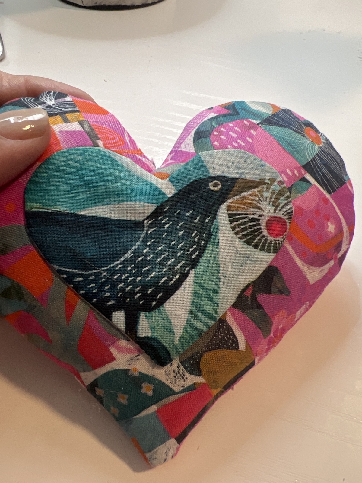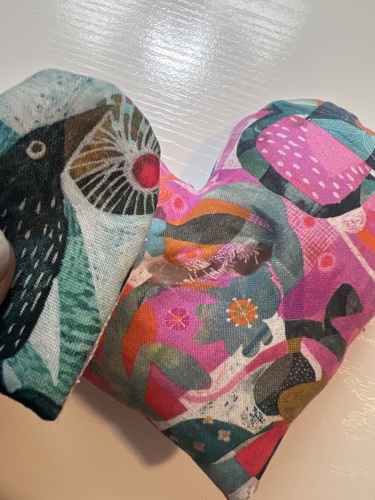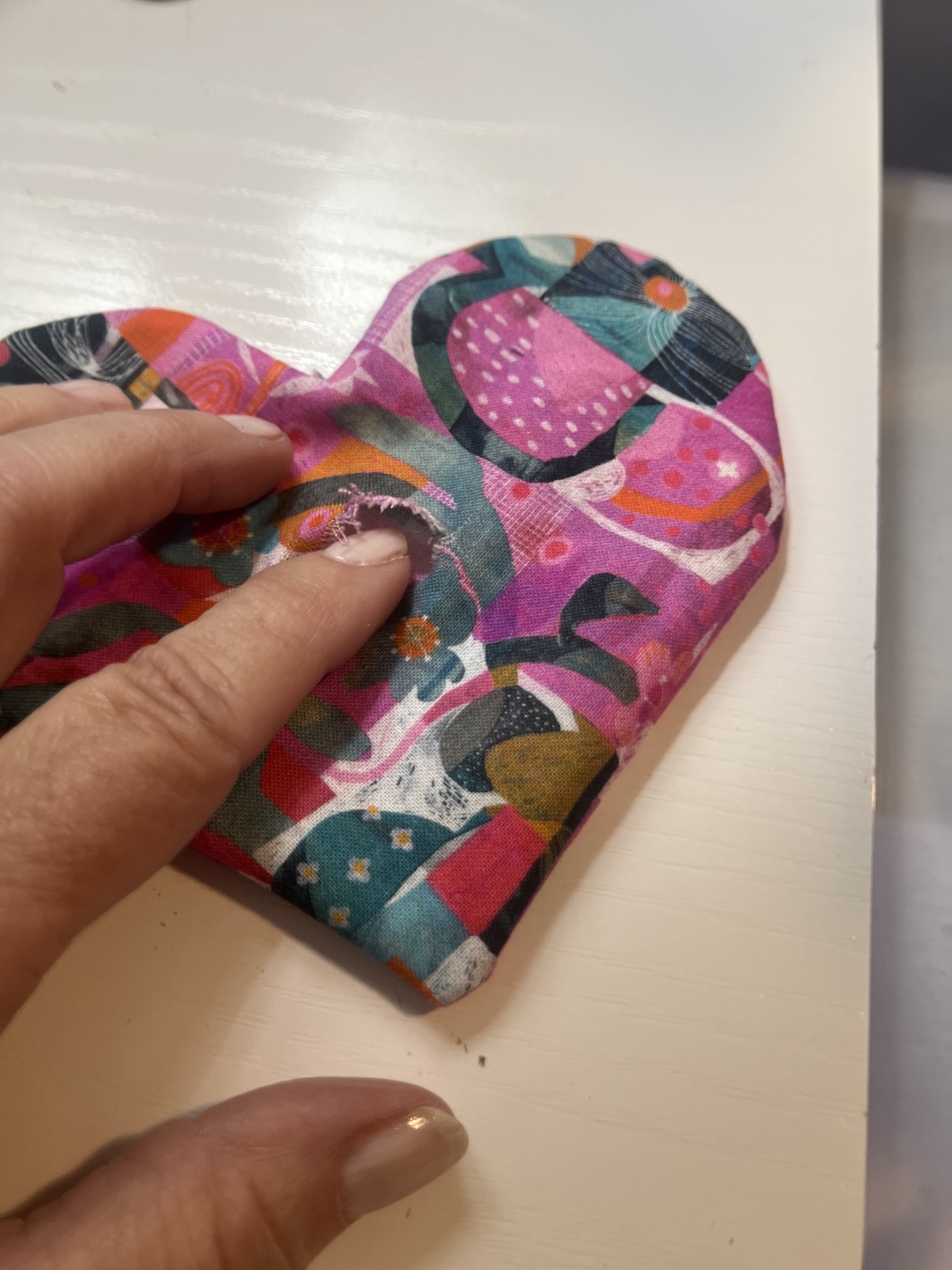 TIP: If you have “overstuffed” the heart, you may need to either take out some stuffing, whipstitch the opening closed, or put a little fabric glue to close the opening before you put the heart over it.