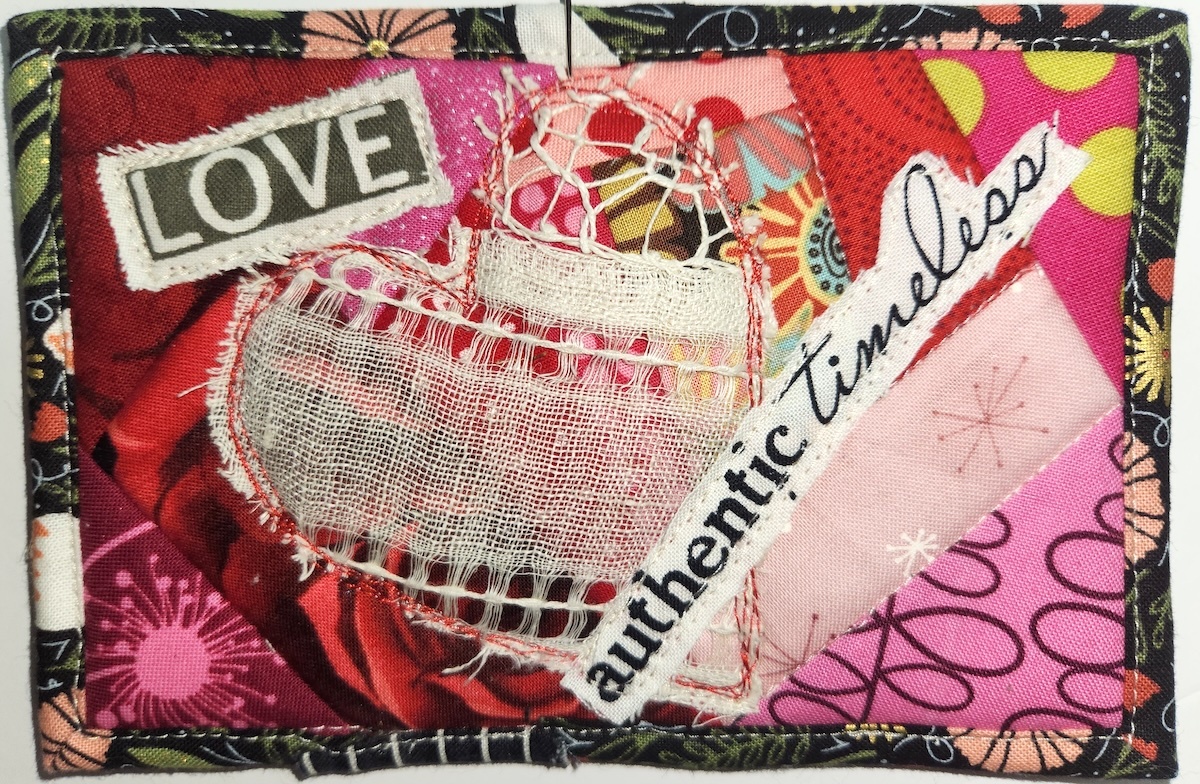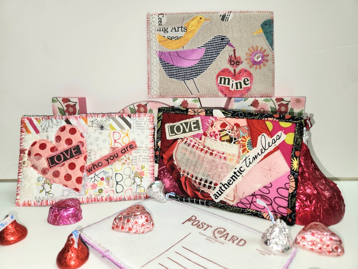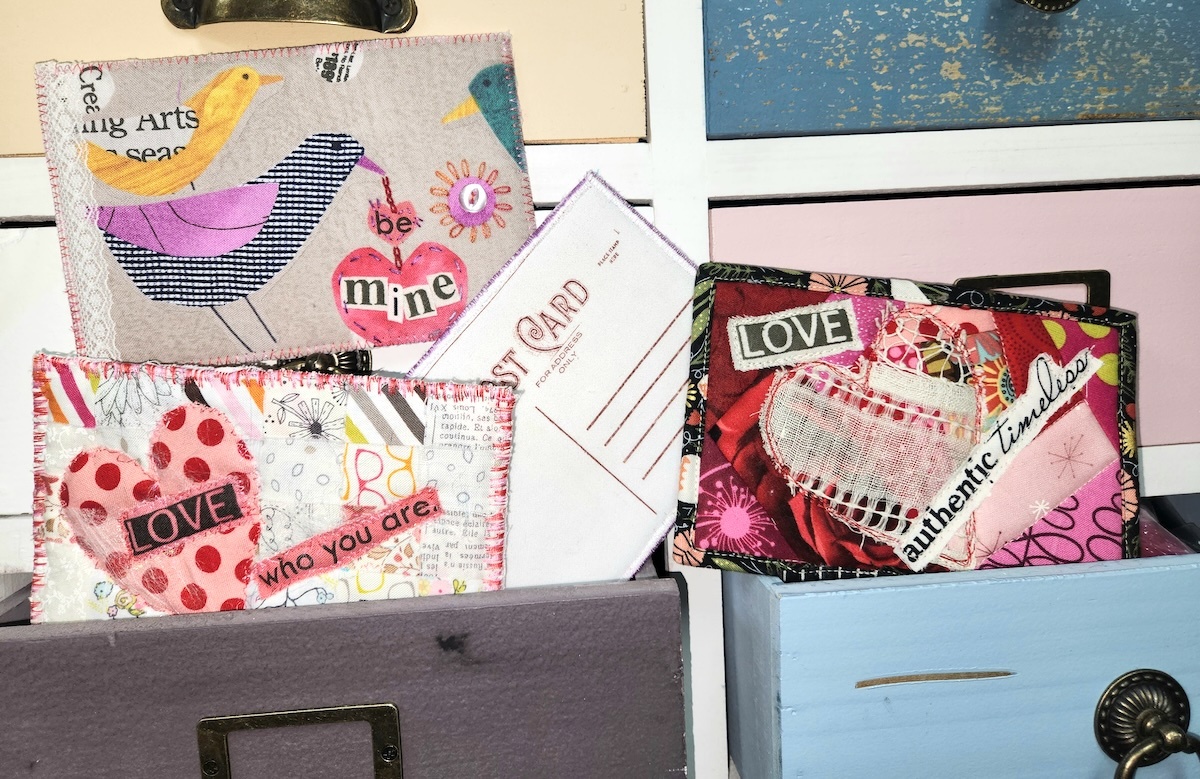 Pull out your fabric and trim scraps, and have fun making quilted Valentine postcards that can be sent in the mail!