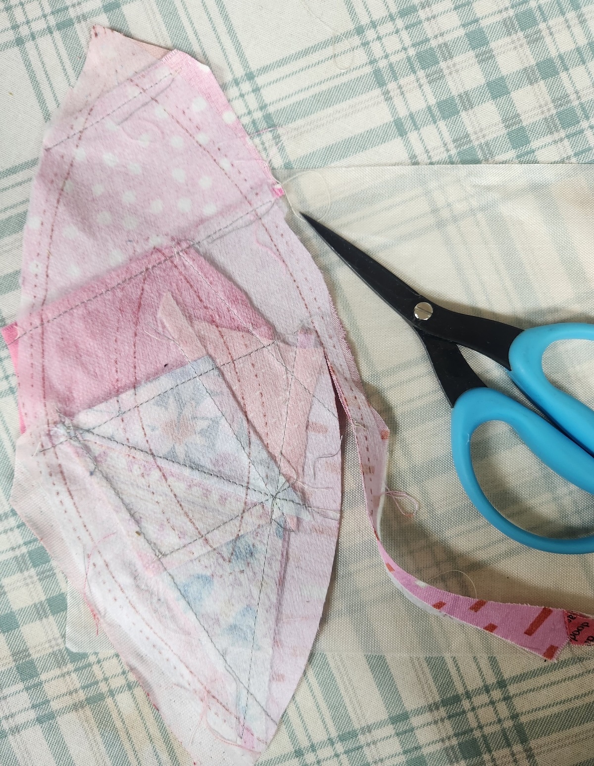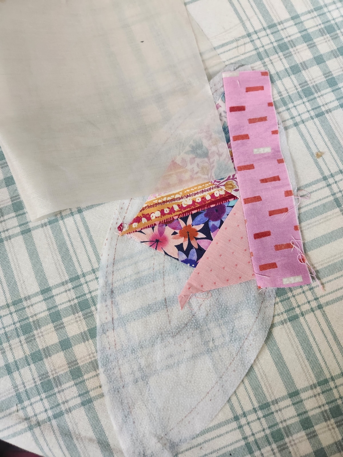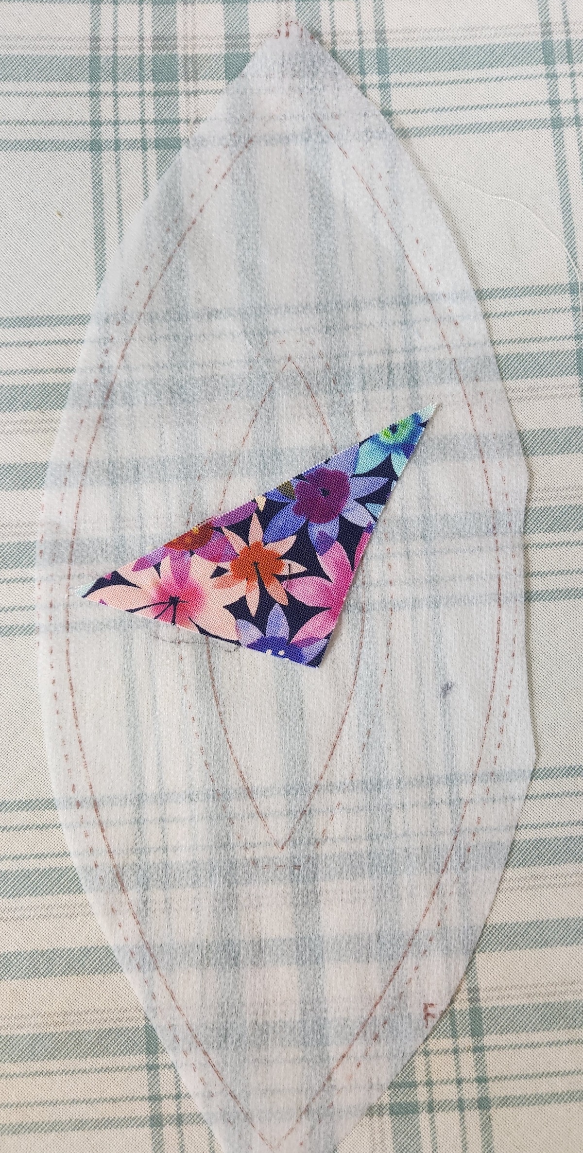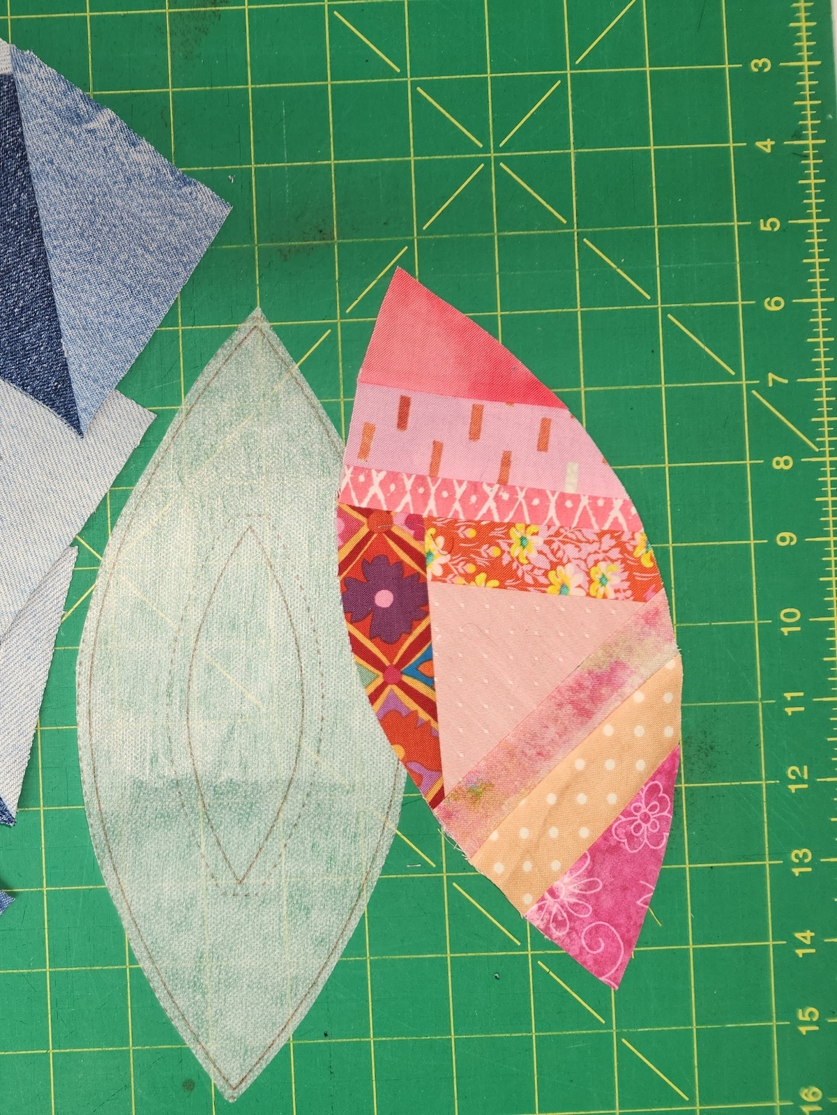 Here you can see where the scraps were stitched together to fill the flower petal. When you're happy with your scrappy flower petal, trim along the dotted line.