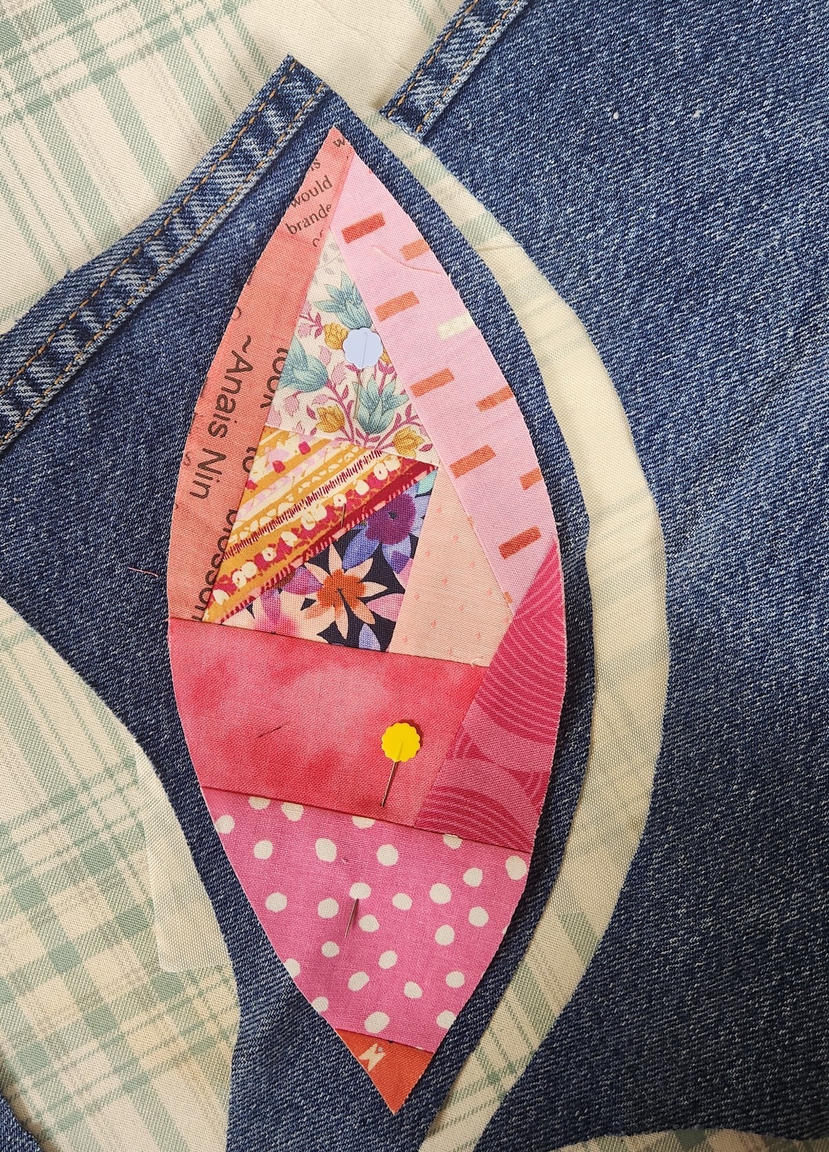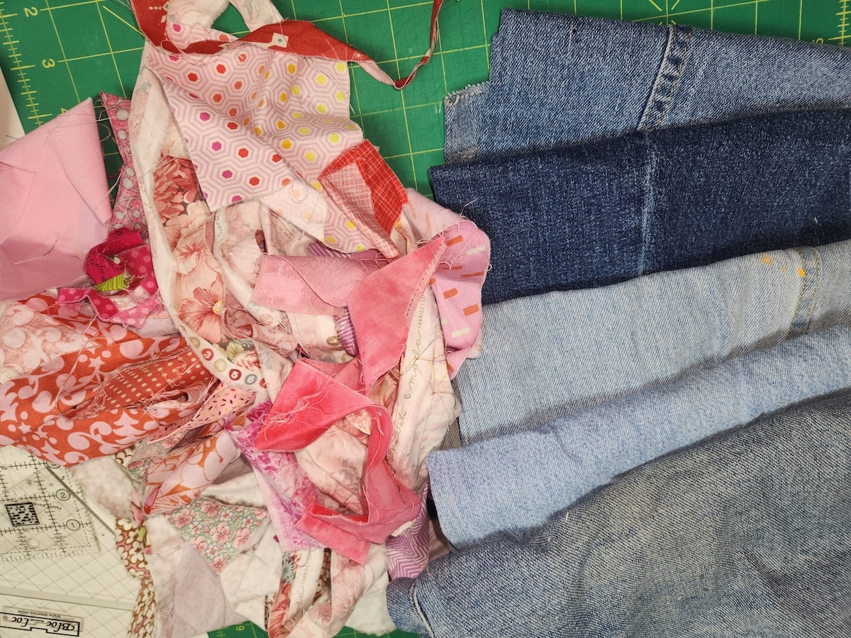 Here I've pulled together a pile of scraps for piecing the flower petals and some old jeans rescued from the donation pile.